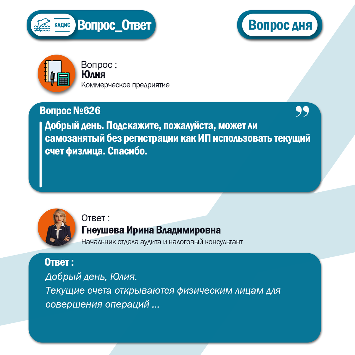 Добрый день. Подскажите, пожалуйста, может ли самозанятый без регистрации как ИП использовать текущий счет физлица. Спасибо. Ответ: Добрый день, Юлия. Текущие счета открываются физическим лицам для совершения операций, не связанных с ведением предпринимательской деятельности в качестве ИП или с частной практикой, а также физическим лицам, применяющим специальный налоговый режим «Налог на профессиональный доход», не являющимися ИП или физическими лицами, занимающимися в установленном законодательством РФ порядке частной практикой, для совершения операций при ведении деятельности, в связи с которой указанные физические лица применяют специальный налоговый режим (п. 2.1 Инструкции Банка России от 30.06.2021г. №204-И «Об открытии, ведении и закрытии банковских счетов и счетов по вкладам (депозитам)»). Таким образом использование самозанятым личной банковской карты при расчетах с клиентами не противоречит режиму использования текущего счета. Учитывая вышеизложенное, самозанятый, зарегистри