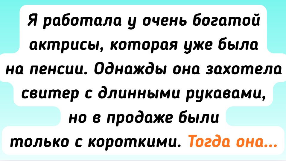 - Я работала у очень богатой актрисы, которая уже была на пенсии. Однажды она захотела свитер с длинными рукавами, но в продаже были только с короткими. Тогда она купила два кашемировых свитера за полторы тысячи долларов и поручила портному разрезать один, чтобы пришить рукава ко второму. Мне пришлось заниматься покупкой и организацией этого процесса. © Sgt_Booler