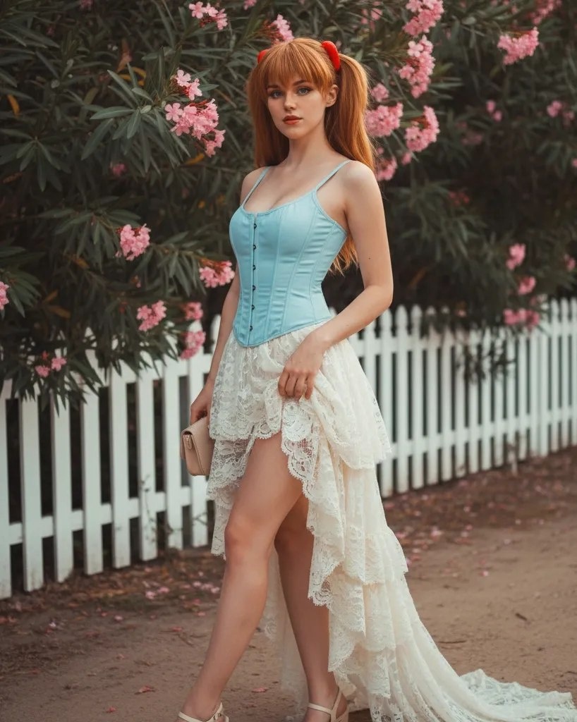 Загрузи свое фото и получи такое же изображение, на котором будешь ты. ✨ Создать фото через сайт ✨ ✨ Создать фото в телеграм боте ✨ Промт для женщины: Фотореалистичное уличное fashion-фото, кадр строго до колен, камера на уровне груди. Локация: грунтовая дорожка вдоль белого деревянного забора; задний план полностью заполнен густыми кустами олеандра с узкими тёмно-зелёными листьями и множеством розовых цветов. Поза: левая нога прямая, правая выставлена вперёд и слегка согнута; корпус немного смещён в сторону. Левая рука держит маленький бежевый клатч у талии, правая придерживает юбку у верхней части бедра вплотную к ноге. Голова ровно, мягкий взгляд в камеру. Одежда: светло-голубой корсет с выраженными вертикальными косточками и тонкими... Все промты для ИИ на нашем сайте и в телеграм канале #реалистичный #лето #романтичное #цветы #женщина