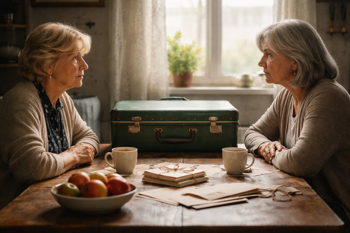 Зелёный чемодан всё ещё стоял у печки. Вера подошла, опустилась на корточки и расстегнула молнию. Внутри лежали аккуратно сложенные письма, детское фотоальбомное платье, маленькие сандалии и ещё один конверт, уже без даты.
