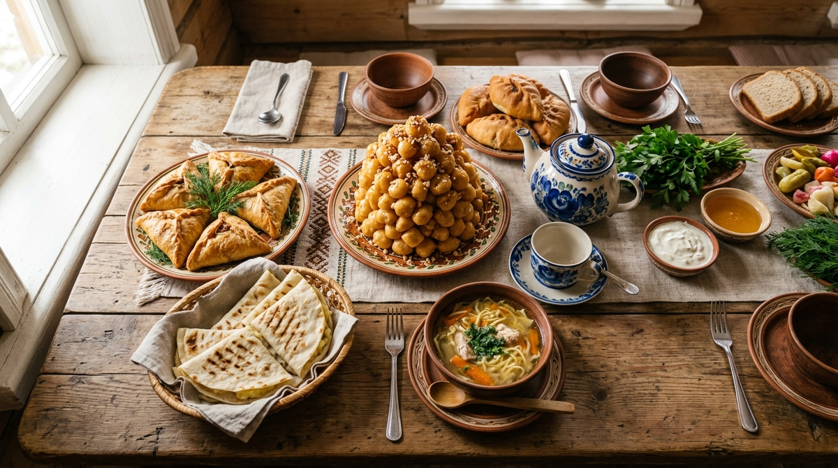 У татарской кухни простая логика: всё, что на столе, должно кормить. Не украшать тарелку, не удивлять подачей — кормить. Тесто замешивают на кефире или на масле, начинку кладут сырой, мёд льют горячим. Свинины нет — Татарстан мусульманский регион. Основа — говядина, баранина, конина, утка, гусь.