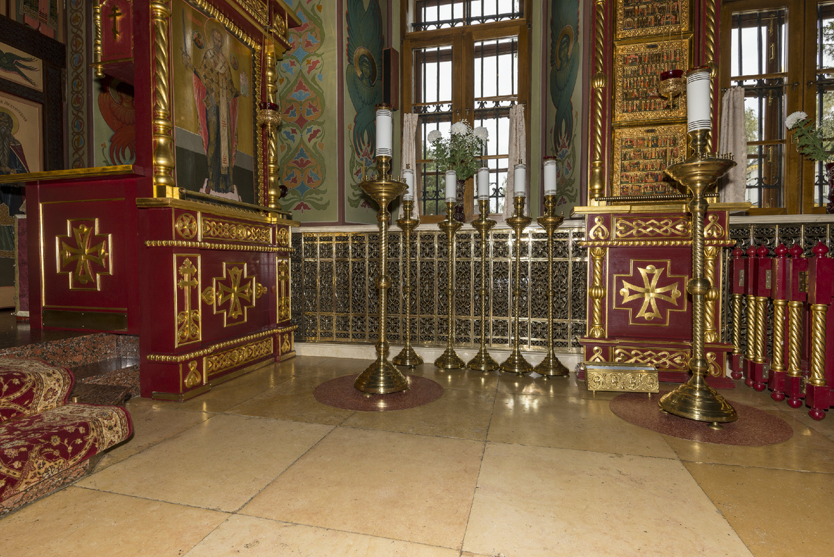 Еще один символ божественной благодати и небесного света в храме — большие подсвечники перед иконами, в которые верующие ставят свои свечи. Напольные подсвечники делают из золотистой латуни, иногда дополняя ее натуральным камнем. Блестящий металл выбран и как символ веры, и как надежная защита от пожара. В полумраке старинного храма латунь, в которой отражаются зажженные свечи, ярко блестит. Это помогает верующим увидеть, куда можно поставить свою свечу.