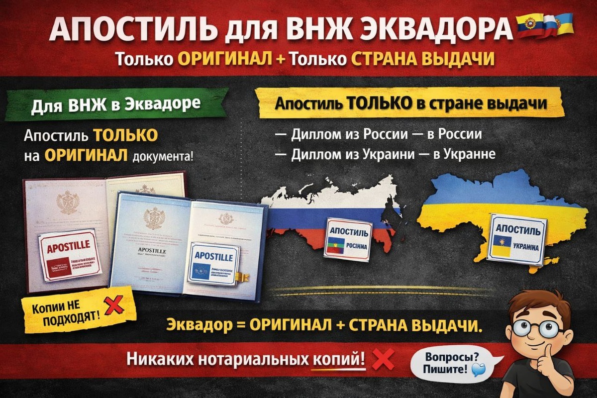🔴 ❗️Главное 👉 Для ВНЖ в Эквадоре апостиль ставится ТОЛЬКО на ОРИГИНАЛ документа. Да, технически в некоторых странах можно поставить апостиль на нотариальную копию. Но для Эквадора это НЕ рабочий вариант. ❗️Второе правило 👉 Апостиль ставится только в стране, где выдан документ. — Диплом из России → апостиль в России — Диплом из Украины → апостиль в Украине Ни через консульства, ни «в другой стране» — нельзя. 📍 Примеры ✔️ Диплом → оригинал + апостиль в стране выдачи ✔️ Свидетельство о рождении/браке → оригинал + страна выдачи ✔️ Справка о несудимости → оригинал + страна выдачи 💥 Итог 👉 Эквадор = только оригиналы + только страна выдачи документа. Нотариальные копии — мимо ❌ Апостиль на нотариально заверенную копию только на документ на оригинал которого нельзя поставить апостиль. Например - трудовой договор удаленного сотрудника. Но это исключение Если есть сомнения по вашему документу — пишите 💬