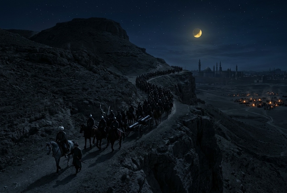 Двадцать тысяч человек шли в темноте, без факелов, без барабанов, без голосов. Только шорох ног по песку и камню, только позвякивание удил, которое гасили тряпками, обмотанными вокруг металла. Луна висела над Мукаттамом, жёлтая, низкая, и тени от скал ложились на дорогу чёрными провалами.