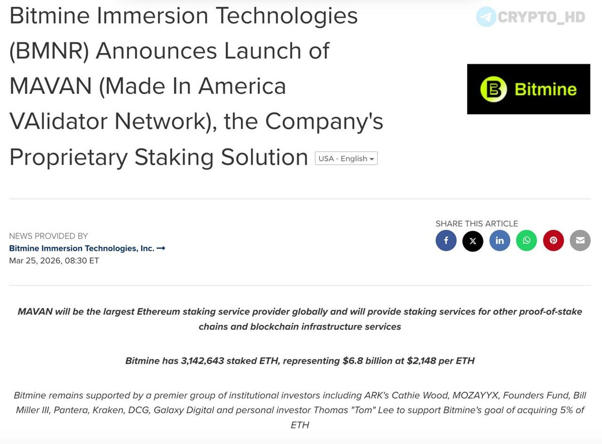 π€ ΠΠΎΠΌΠΏΠ°Π½ΠΈΡ Bitmine (Π’ΠΎΠΌΠ° ΠΠΈ) Π·Π°ΠΏΡΡΡΠΈΠ»Π° Π΄Π»Ρ ΠΈΠ½ΡΡΠΈΡΡΡΠΈΠΎΠ½Π°Π»ΠΎΠ² ΠΏΠ»Π°ΡΡΠΎΡΠΌΡ MAVAN β Π΄Π»Ρ ΡΡΠ΅ΠΉΠΊΠΈΠ½Π³Π° #ETH
