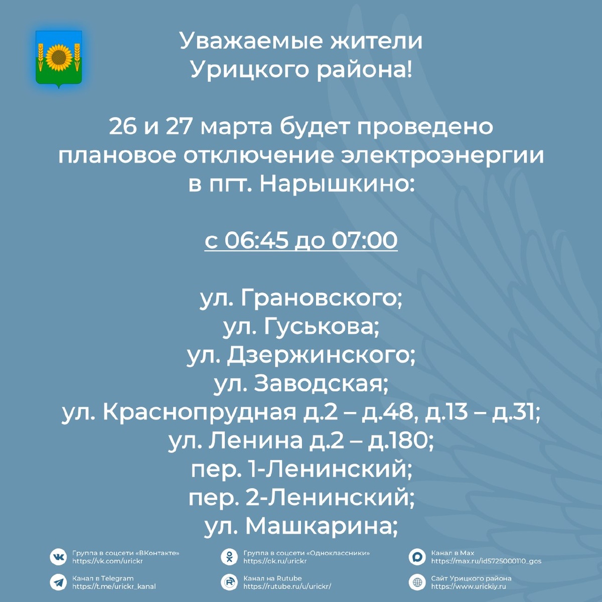 ! 📢 26 и 27 марта будет проведено плановое отключение электроэнергии в поселке Нарышкино. Все подробности в карточках ⬆ #УрицкийРайон #АдминистрацияУрицкогорайонаОрловскойобласти