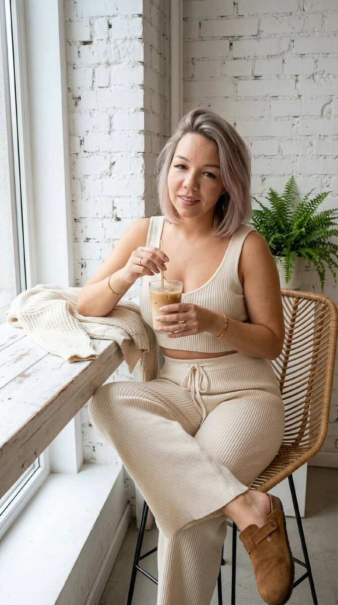 🌟Переходим на удобный сервис для генерации: Ссылка 👉 Syntx Ai Ссылка 👉 Veo3 📌ИНСТРУКЦИЯ ПО ИСПОЛЬЗОВАНИЮ В ЗАКРЕПЛЕННЫХ СООБЩЕНИЯХ 👍👍👍👍👍👍 ⚠️ПОДПИШИСЬ НА РЕЗЕРВНЫЕ КАНАЛЫ 👇 📱 канал в ВК 📱 канал в МАХ ◾️ПРОМПТ : Не меняй черты лица Модель, сидящая на стуле, позирует у окна в светлой и стильной студии или кафе. Она смотрит прямо в камеру, слегка наклонив голову, с непринужденным, уверенным выражением лица и легкой улыбкой. Волосы цветом как на фото, короткие, но густые, красиво уложены, с объемом у Корней. Модель одета в удобный и элегантный трикотажный комплект кремового цвета: укороченный топ на бретелях и широкие брюки в рубчик с завязками на поясе. Свитер или кардиган из того же материала небрежно наброшен рядом с ней на деревянной столешнице. В руках она держит прозрачный стакан с напитком с соломинкой. Акценты в виде минималистичных золотых браслетов и кольца. Модель обута в одну коричневую замшевую домашнюю обувь или мюли.Освещение мягкое естественное.Фон с
