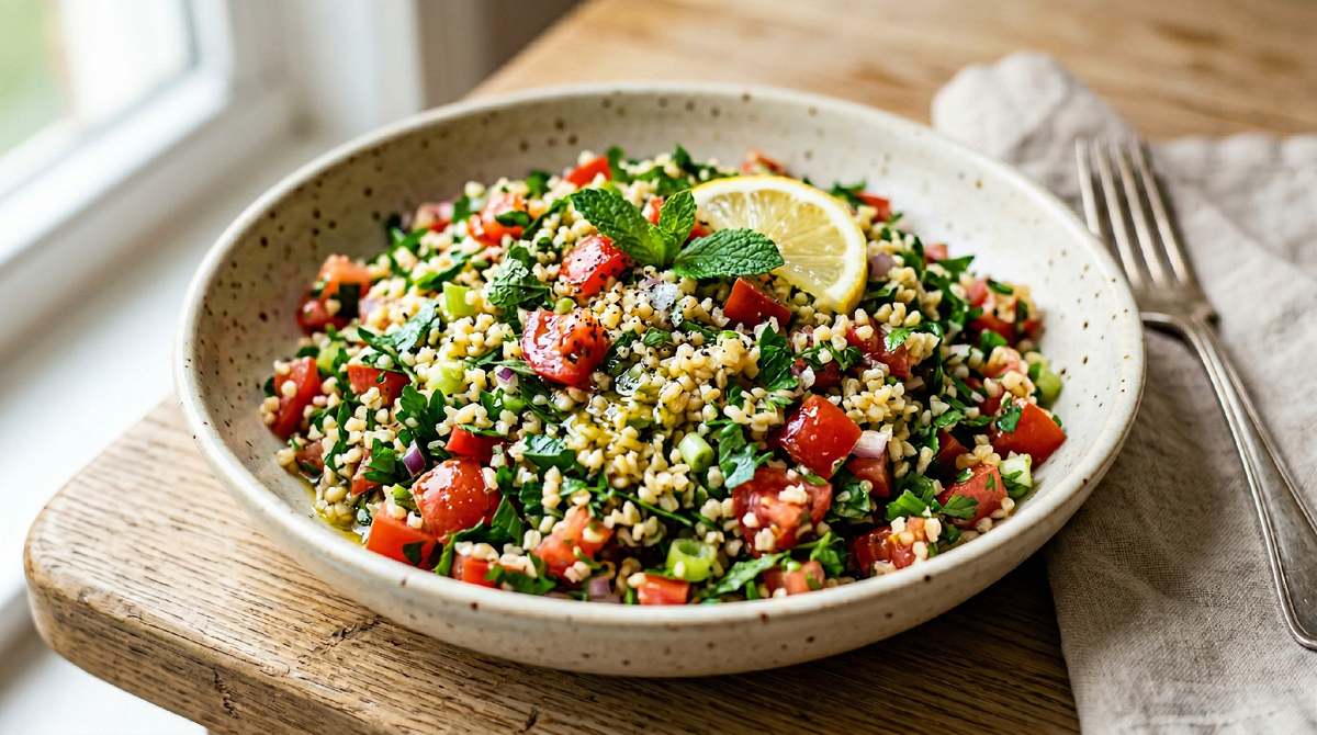 Есть блюда, которые как будто созданы для тех моментов, когда хочется чего-то свежего, лёгкого и при этом сытного, но совершенно нет желания стоять у плиты. Табуле — из таких. Этот салат пришёл к нам с Ближнего Востока, прочно обосновался в средиземноморской кухне и постепенно завоевал сердца людей по всему миру. И знаете что самое удивительное? Для базовой версии достаточно всего трёх компонентов: булгура, спелых помидоров и свежей мяты. Ни кастрюль на огне, ни духовки, ни сложных манипуляций. Пятнадцать минут — и перед вами полноценное блюдо, которое одинаково хорошо смотрится и на будничном обеде, и на праздничном столе.