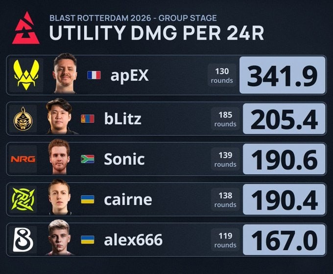 Топ игроков BLAST Rotterdam 2026 по утилити урону за 24 раунда (групповая стадия)