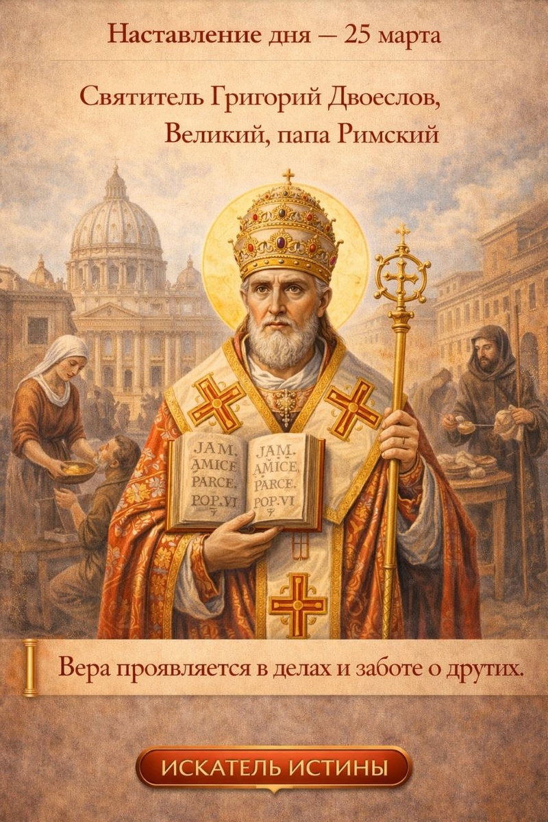 Святитель Григорий Двоеслов, Великий, папа Римский В этот день Церковь вспоминает святителя Григория Двоеслова — пастыря, учителя и устроителя церковной жизни, который соединил глубокую духовную жизнь с деятельным служением людям. Он жил в непростое время, когда требовались не только слова, но и конкретные дела. Святитель заботился о нуждающихся, устраивал церковную жизнь и наставлял паству не отвлечённо, а через ясное и понятное учение. Его пример показывает, что истинная вера не замыкается внутри человека. Она обязательно проявляется в заботе о других, в ответственности и внимании к тем, кто рядом. Святитель Григорий не искал славы, но нёс служение как долг. Он понимал, что духовная жизнь требует труда — постоянного, внимательного, без суеты. Особенно важно его наставление о соединении молитвы и дела. Нельзя ограничиваться только словами или только внешней деятельностью — одно без другого теряет смысл. Сегодняшний день напоминает: человек должен стремиться к внутренней собраннос