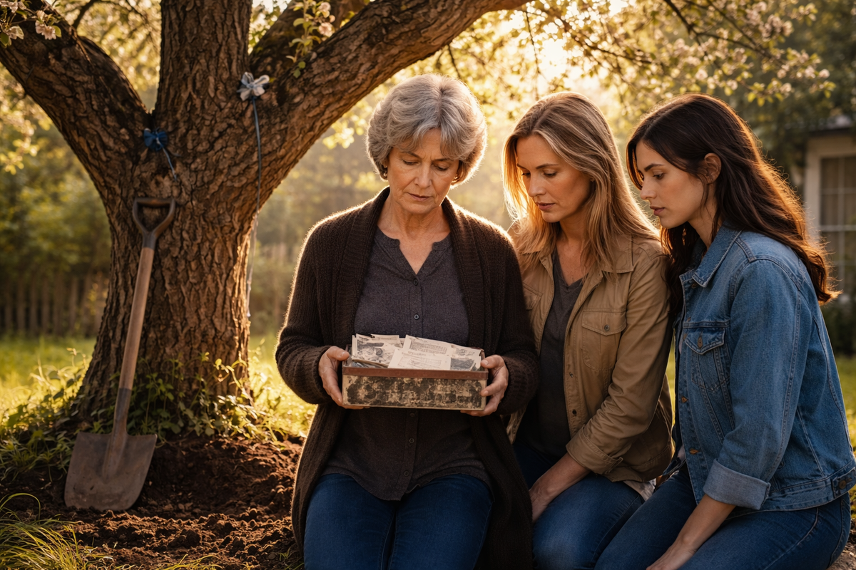 Лариса поднялась, оглянулась на свежую землю у корней и впервые за много лет не почувствовала, что этот двор держит её силой. Яблоня стояла на том же месте. Земля у ствола снова была вскопана. Только теперь под ней лежала не чужая тишина, а несколько честных строк.