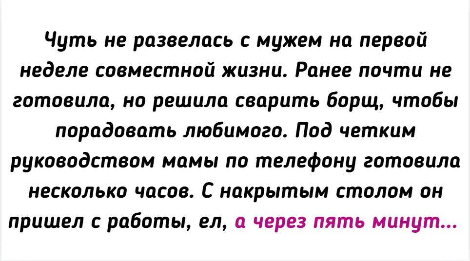 - Чуть не развелась с мужем на первой неделе нашей совместной жизни. Раньше я почти не готовила, но хотела порадовать его, поэтому решила сварить борщ. Под четким руководством мамы по телефону готовила несколько часов. Накрыла на стол с радостью. Он приходит с работы, ест, а через 5 минут спрашивает: «Это курица? Борщ с курицей не готовят!» Скривил лицо и отодвинул тарелку. Я в ярости, чуть не швырнула тарелку. Крики, сбор чемоданов. Потом помирились.
