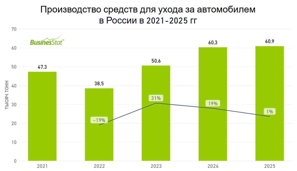 В 2021-2025 гг производство средств для ухода за автомобилем в России выросло на 29% – с 47,3 до 60,9 тысяч тонн.