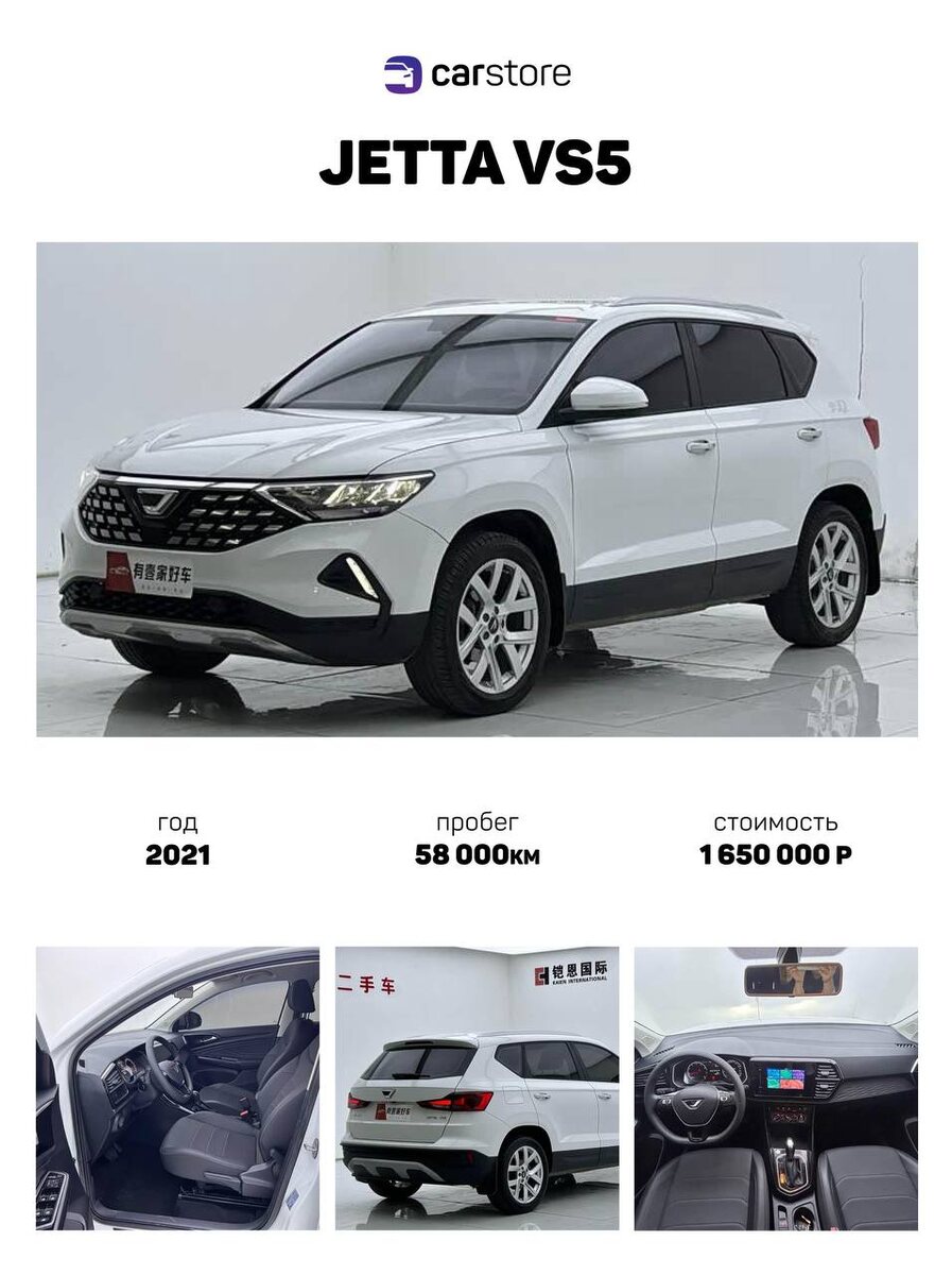 Год: 2021 Пробег: 58 000 км Стоимость — 1 650 000 ₽ 🔥 Jetta VS5 - это по сути Volkswagen, только под отдельным брендом для Китая. Марка Jetta была создана концерном Volkswagen совместно с FAW, а сами автомобили собираются на заводе FAW-Volkswagen и используют платформу и моторы VAG. Модель VS5 построена на платформе Volkswagen MQB и технически близка к Volkswagen Tharu / Skoda Karoq / SEAT Ateca. Напишите нам для заказа @hello_carstore