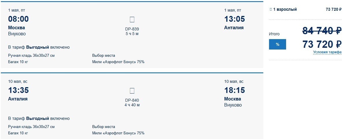 Во всяком случае, из Москвы в Анталью на майские праздники. Слетать туда-обратно с 1-го по 10-е число предлагается с учетом скидки за 73,7 тыс. руб., в тариф включено 10 кг багажа. А комбинация чартерных рейсов «Уральских авиалиний» и Corendon Airlines стоит на те же даты на 15 тыс. меньше. Наличие мест и цены мы проверяли в 15:30. О том, получится ли сэкономить по акции «Победы» на маршруте из российской столицы в Стамбул, читайте на ТурДоме. @tourdom