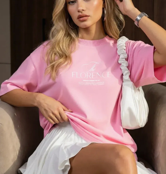 Розовая футболка оверсайз — это база, которая выглядит гораздо интереснее привычной белой. Мягкий розовый оттенок освежает лицо и делает образ более «живым», при этом не выглядит слишком ярко или навязчиво. Оверсайз крой создаёт расслабленный силуэт, который сейчас является одним из главных трендов.