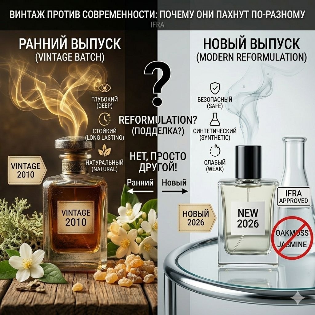 ароматов. Думают, что подделки Что ж, время для развенчания ещё одних слухов. Ода ушедшей эпохе, или почему ваш новый флакон пахнет «не так» (и нет, это не подделка) Признавайтесь, сколько раз вы, брызнув на запястье свежекупленный любимый аромат, разочарованно морщили нос? «Не то! Раньше шлейф был до Луны, а сейчас — три пшика и тишина. Стойкость нулевая, база плоская. Точно фейк подсунули!». Спойлер: скорее всего, вас никто не обманывал. Аромат оригинальный. Просто он другой. И вот почему. Главный злодей: IFRA (Международная ассоциация парфюмерных материалов) Это такие люди в белых халатах, которые сидят в Брюсселе и очень заботятся о вашем здоровье (и о своей юридической безопасности). У IFRA есть список запрещенных и ограниченных к использованию ингредиентов, который они пополняют с завидной регулярностью. Их логика: «Вот этот прекрасный дубовый мох, который давал ту самую шипровую глубину, может вызвать аллергию у одного человека из миллиона? Запретить!». Или: «Натуральны