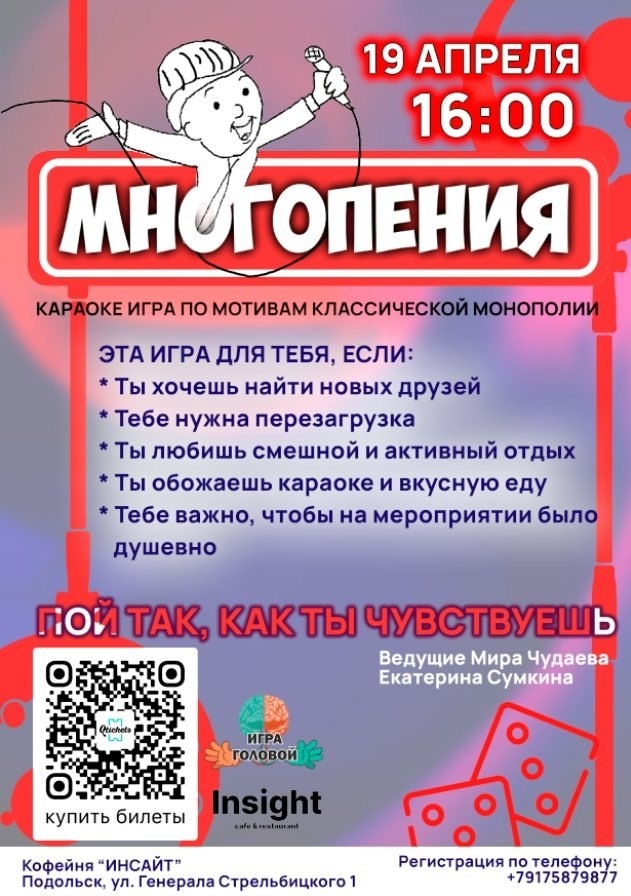 " Приглашаем вас окунуться в атмосферу увлекательной игры ярких вокальных выступлений на нашей уникальной караоке-вечеринке по мотивам легендарной настольной игры «Монополия». Автор и организатор Мира Чудаева. Дата и время проведения: 19 апреля 2026 г. в 16:00 Место встречи: Кафе "Инсайт" Подольск, ул. Генерала Стрельбицкого 1 Здесь вы сможете почувствовать себя настоящими магнатами и финансы потянутся к вам вместе с нотами ваших любимых песен! Что вас ждет? - Захватывающие музыкальные баталии - Возможность выиграть ценные призы - Атмосферные коктейли и закуски - Фотозона с элементами монополии Условия участия: Регистрация обязательна по телефону: +79175879877 Пусть голос звучит громче финансовых отчетов! И помните! Не важно как вы поете, важно, что именно вы в этот момент чувствуете. ВНИМАНИЕ! Цена билета увеличивается с 16 апреля каждый день на 100 рублей - торопитесь! Билеты тут: https://podolsk.qtickets.events/225402-mnogopeniya