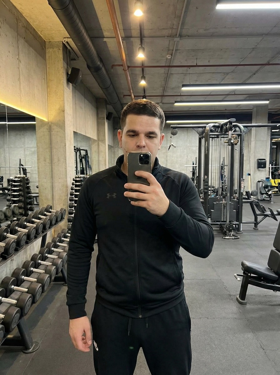 🤖Генерировать можно здесь: 👉БОТ ДЛЯ ГЕНЕРАЦИИ Режим Nano Banana 2/Pro ИНСТРУКЦИЯ > Реалистичное фото молодого привлекательного мужчины с загруженного фото, черты лица, форма глаз, цвет волос и общий облик мужчины строго перенесены с загруженного референсного фото - точное сходство обязательно. Одет в чёрную спортивную кофту с логотипом на груди и чёрные штаны. Он стоит в современном тренажёрном зале с бетонными стенами, открытыми трубами под потолком и множеством тренажёров на заднем плане. Мужчина держит телефон перед зеркалом, делая селфи — его лицо частично скрыто телефоном, взгляд направлен в камеру телефона. Освещение — смешанное: тёплые точечные светильники сверху и холодный фоновый свет от оборудования. Камера расположена на уровне глаз, ракурс — прямой, с лёгким наклоном вниз. Глубина резкости средняя — фон не размыт, детали зала читаются. Качество изображения высокое, чёткое, с естественной цветопередачей. Стиль съёмки — повседневный, документальный, как будто снято на смарт