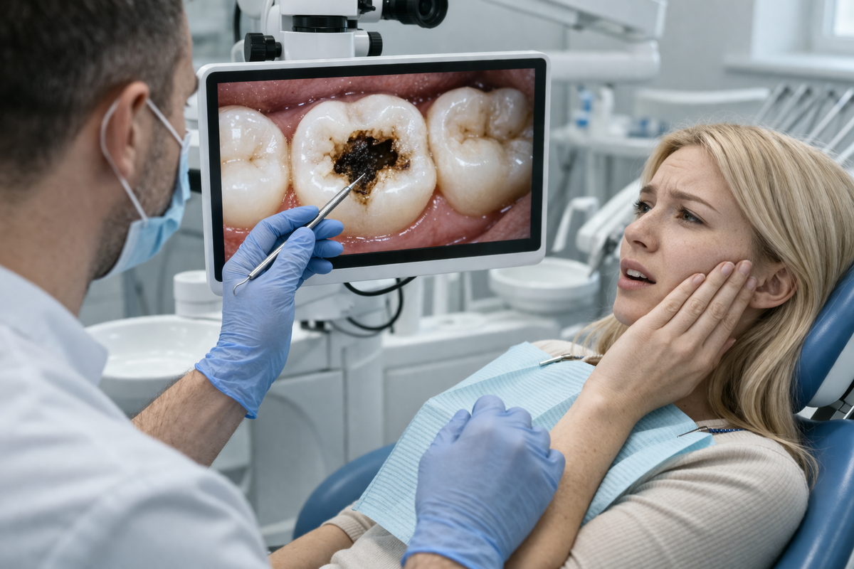 👉 «Доктор, просто немного ноет…» А когда смотрим — внутри уже серьёзное разрушение. Кариес — это не боль. Это процесс. Сначала он: 👉 Пока нерв не задет — боли может не быть вообще. Поэтому человек живёт спокойно, думая, что всё нормально. Если ты чувствуешь: Это уже не «начало». 👉 Это значит, что кариес ушёл глубоко. И лечится это уже не так просто, как маленькая пломба. Иногда зуб: И человек радуется: