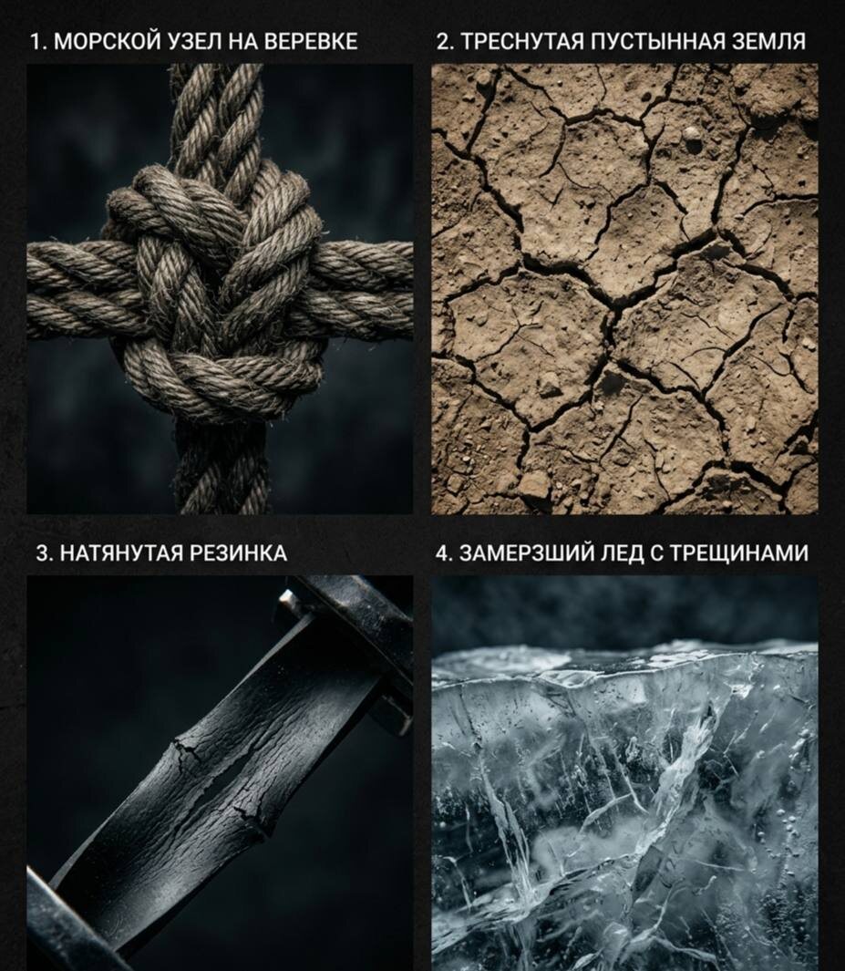 В голове всё логично: «просто накопилось», «у всех так», «надо просто выспаться», а тело в это время буквально каменеет от напряжения, но мы предпочитаем этого не замечать. Давай проверим, что на самом деле происходит с твоей нервной системой прямо сейчас. Посмотри на картинку ниже. Отключи логику. Поймай первую телесную ассоциацию: на какую из этих четырех текстур сейчас больше всего похоже твое состояние изнутри? 1. Туго затянутый узел 2. Сухая, потрескавшаяся земля 3. Натянутая до предела струна 4. Толстый, мутный лёд Пиши свою цифру в комментарии. Как соберется 40 комментариев дам полную расшифровку где конкретно застрял твой стресс и почему у тебя ни на что нет сил. Посмотрим, кого сегодня больше 👇