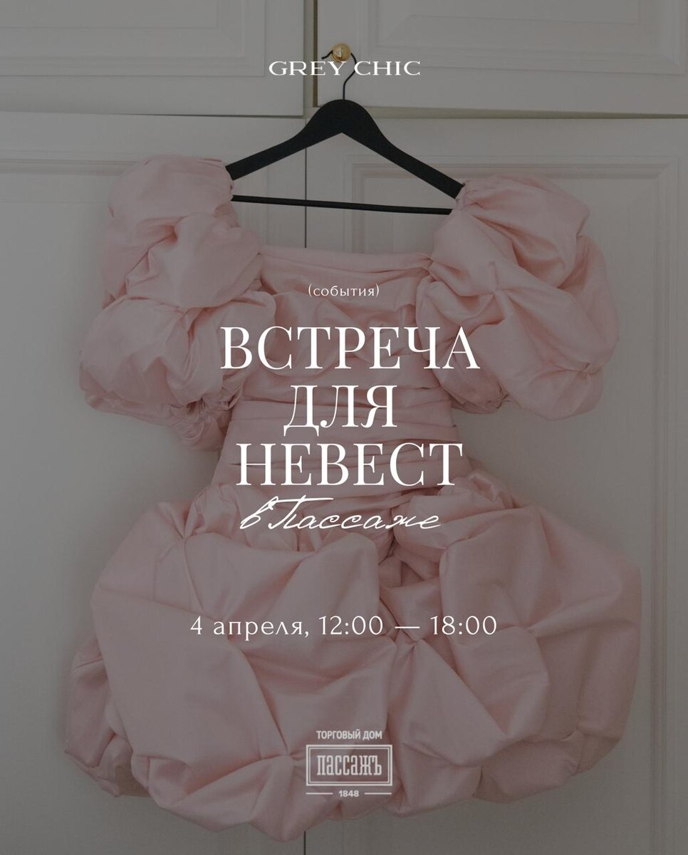 Какое невероятное событие для вас готовим!🩷 4 апреля GREY CHIC приглашает на открытую встречу для невест и их подруг. В преддверии свадебного сезона и выхода долгожданного номера журнала GREY CHIC`26 мы готовиммного интересного. Что вас ждёт: 🟡Лекции от крупных представителей свадебной индустрии: основателя проекта GREY CHIC и одноименного свадебного агентства Ольги Малиновской, модного стилиста Екатерины Коптяевой (Яцковской), топового фотографа Сергея Графа, визажиста с 17-летним опытом работы и основателя студии макияжа Ольги Петровой; 🟡Примерка свадебных образов от различных брендов Пассажа (Stas Lopatkin, Modername, Кирпичи (дизайнер Ольга Филатова), Kogel, Gooskova vintage, Estelle Adony); 🟡Мастер-класс от визажиста студии Ольги Петровой в пространстве Рив Гош 🟡Презентация свадебной полиграфии от одного из лучших дизайнеров Дарьи Тихомировой (Люпин Дизайн); 🟡Дегустация начинок свадебных тортов от Софьи Дерусовой; 🟡Дегустация вин от Piemaggio; 🟡Лотерея и подарки от парт