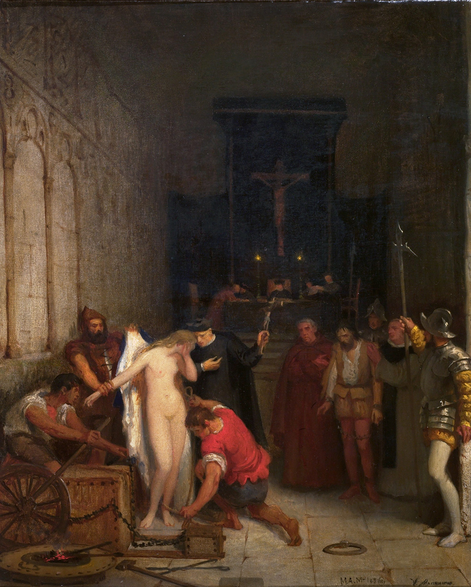 Перед нами подготовительный эскиз, находящийся сегодня в музее Прадо, к более крупной картине, которая осталась в семье художника. По возвращении в Мадрид после пребывания в Риме, а затем в Париже, испанский художник Виктор Мансано-и-Медерода (1831-1865) начал экспериментировать с новым способом изображения пространства на своих исторических полотнах. На этом эскизе, нарисованном в 1859 году, он решил продемонстрировать плотную атмосферу полумрака в замкнутом помещении. Мы видим фигуры, находящиеся в тени мрачной часовни. Внутренняя архитектура задумана как настоящая сцена с ярко выраженной игрой перспективы. Полумрак, в который она погружена, смягчается, постепенно усиливающимся, тусклым светом свечей алтаря на заднем плане. Среди фигур, окутанных этим светом, отчетливо выделяется обнажённое тело молодой жертвы предстоящей пытки. Белый плащ, который с неё снимают и на котором концентрируется свет, подчёркивает фигуру девушки. Этот цветовой акцент безошибочно выделяет главную гер