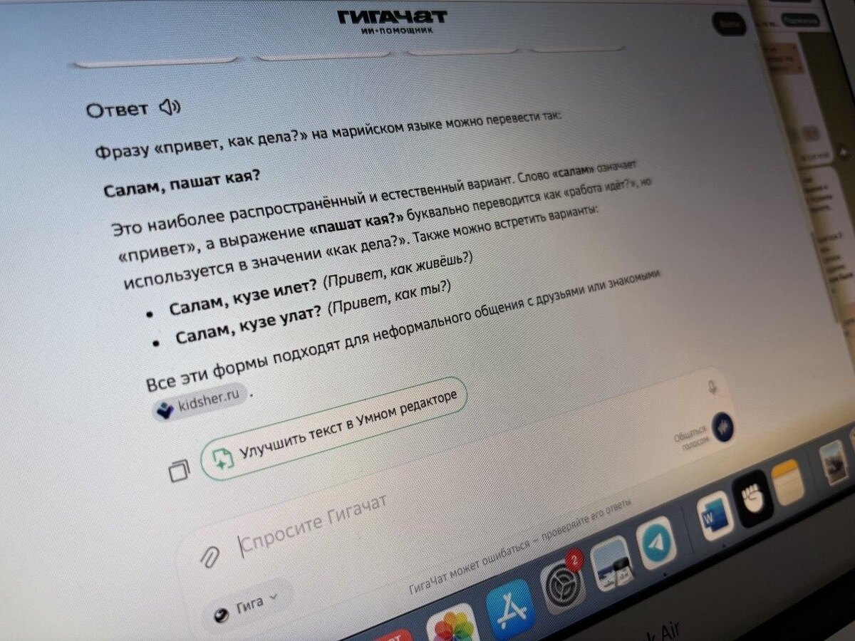 марийский язык. По словам сотрудника МарНИИЯЛИ, сейчас нейросеть от Сбера поддерживает марийский на самом высоком уровне среди других нейросетей. Например, она понимает язык народа мари лучше, чем Gemini от Google. Впрочем, общаться с «ГигаЧатом» можно и на горномарийском языке, так как нейросеть понимает и его, но хуже, чем луговомарийский. Это объясняется тем, что данных, на которых обучается ИИ, пока недостаточно. 📸 Фото: ИА «МедиаПоток» Подписывайтесь на наш канал в МАХ!