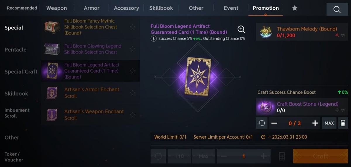 Крафт легендарного (фиол) артефакта с шансом от 5%. Стоимость попытки создания составляет 1200 итемов «Thawborn Melody». При покупке недельного набора за 1500 алмазов можно получить 160 итемов, плюс карты, расходку, мили. На этом регионе доступно в неделю для покупки 10 наборов (15000 алмазов). Итого 1600 итемов при выкупе недельного набора. Базовый шанс создания артефакта составляет 5%, шанс на успешное создания можно повысить до 20% максимум. Для увеличения шанса на создания используется Камень Улучшения Создания (Легендарный) / Craft Boost Stone (Legend), каждый из камень увеличивает шанс на 5%, можно добавить до 3 камней. При неудачной попытки на создания артефакта возвращается 120 итемов. Также с шансом 50% можно получить камень улучшения создания.