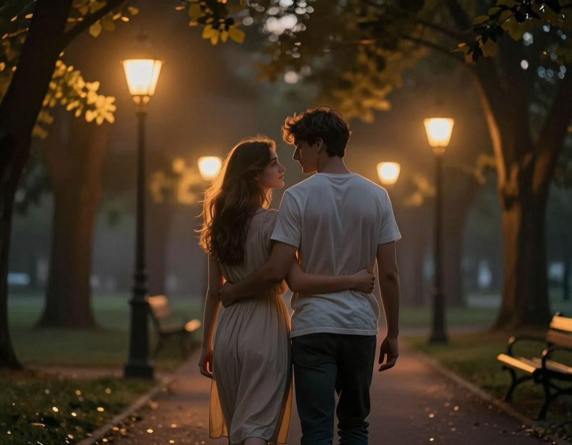 Они пошли вдоль улицы, освещённой вечерними огнями. Фонари отбрасывали длинные тени, а редкие капли дождя всё ещё падали с неба, сверкая, как крошечные бриллианты. Катя вдруг остановилась, посмотрела на Дениса и рассмеялась – впервые за долгое время искренне, от души.