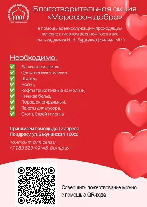 Отдел по делам молодежи Московской (городской) епархии проводит благотворительную акцию «Марафон добра», в рамках которой организован сбор гуманитарной помощи для военнослужащих, проходящих лечение в Главном военном клиническом госпитале имени академика Н.Н. Бурденко (филиал № 1). Пункт сбора гуманитарной помощи расположен на территории храма святителя Николая Мирликийского в Покровском по адресу: ул. Бакунинская, д. 100, стр. 6. Прием помощи осуществляется ежедневно с 11:00 до 17:00 до 12 апреля включительно. В качестве гуманитарной помощи принимаются влажные салфетки, одноразовые пеленки, шорты, носки, трикотажные кофты на молнии, нижнее белье, стиральный порошок, пакеты для мусора, скотч и стрейч-пленка. Также можно оказать финансовую помощь, перечислив удобную сумму с пометкой «ГОСПИТАЛЬ» — все собранные средства будут направлены на приобретение необходимых товаров для военнослужащих. По вопросам участия в акции можно обращаться по телефону: 8 (985) 825-49-48 (Валерия). Подробнее: