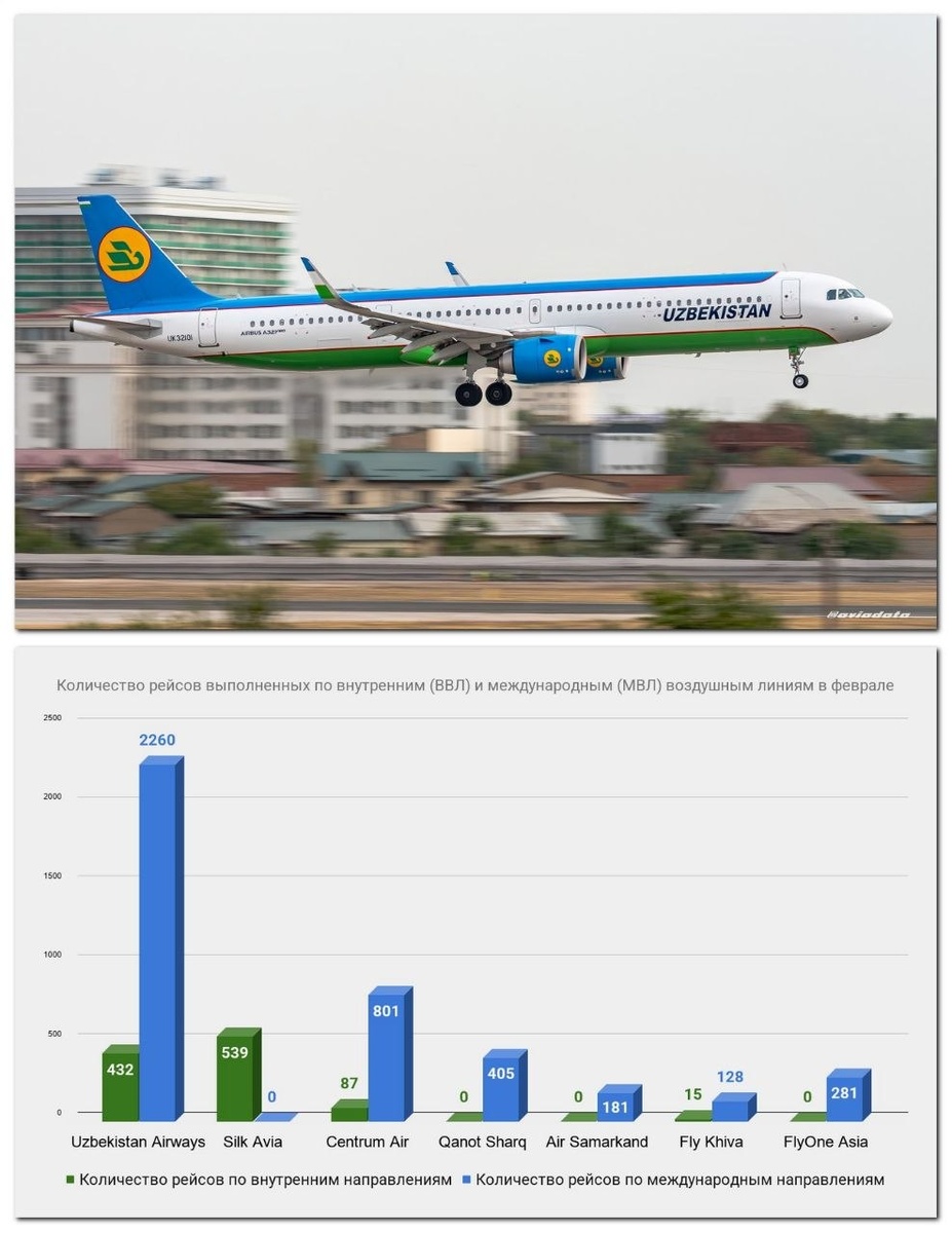 На графике показано количество выполненных рейсов по внутренним и международным направлениям по каждой авиакомпании за февраль. Кратко - топ 5 по направлениям для каждой авиакомпании и количество выполненных рейсов по ним за февраль: 🔸Silk Avia Tashkent — Termez (64) Tashkent — Bukhara (45) Tashkent — Karshi (29) Tashkent — Kokand (28) Tashkent — Shahrisabz (23) 🔸Centrum Air Tashkent — Dubai (27) Tashkent — Jeddah (24) Tashkent — Moscow (24) Tashkent — Urgench (24) Tashkent — Istanbul (20) 🔸Qanot Sharq Tashkent — Moscow (30) Tashkent — Dubai (19) Tashkent — Istanbul (16) Tashkent — Phuket (15) Tashkent — Seoul (12) 🔸Uzbekistan Airways Tashkent — Moscow (105) Tashkent — Istanbul (64) Tashkent — Urgench (61) Tashkent — Nukus (56) Tashkent — Almaty (52) 🔸Air Samarkand Tashkent — Jeddah (42) Namangan — Jeddah (16) Termez — Jeddah (13) Samarkand — Jeddah (11) Fergana — Jeddah (2) 🔸Fly Khiva Tashkent — Medina (30) Tashkent — Sharm el-Sheikh (8) Tashkent — Urgench (7) Urgench — M