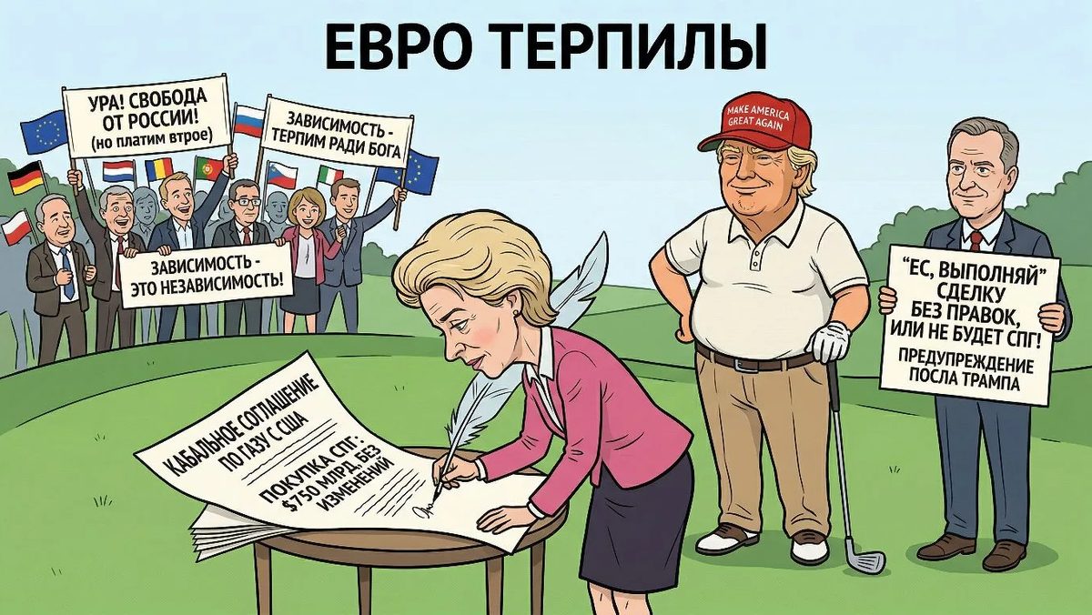 Помните, как унизительно престарелая гинекологиня приехала подписывать в гольф клуб Трампа кабальные условия по покупке газа у США на 750 млрд? А как в Европе орали от счастья, что теперь они освободились от зависимости от России? А ещё недавно пошли слухи, что ЕС после попытки захватить Гренландию может отказаться от сделки с США. Ну, какие же они идиоты… Financial Times рассказывает, как на самом деле выглядит независимость от нашей страны. Цитирую: «ЕС должен выполнить своё торговое соглашение с США без поправок, иначе он рискует потерять «благоприятный» доступ к поставкам сжиженного природного газа от американских экспортёров, предупредил посол Дональда Трампа в блоке». Мне кажется, что даже алкашня за гаражами выглядит более достойно, чем европейские терпилы, потому что, ну, очень глупые. Но, смешные. Это у них не отнять!