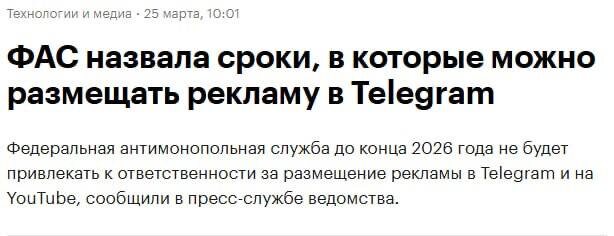 Рекламу в Telegram и на YouTube разрешили размещать до конца 2026 года — об этом заявила ФАС