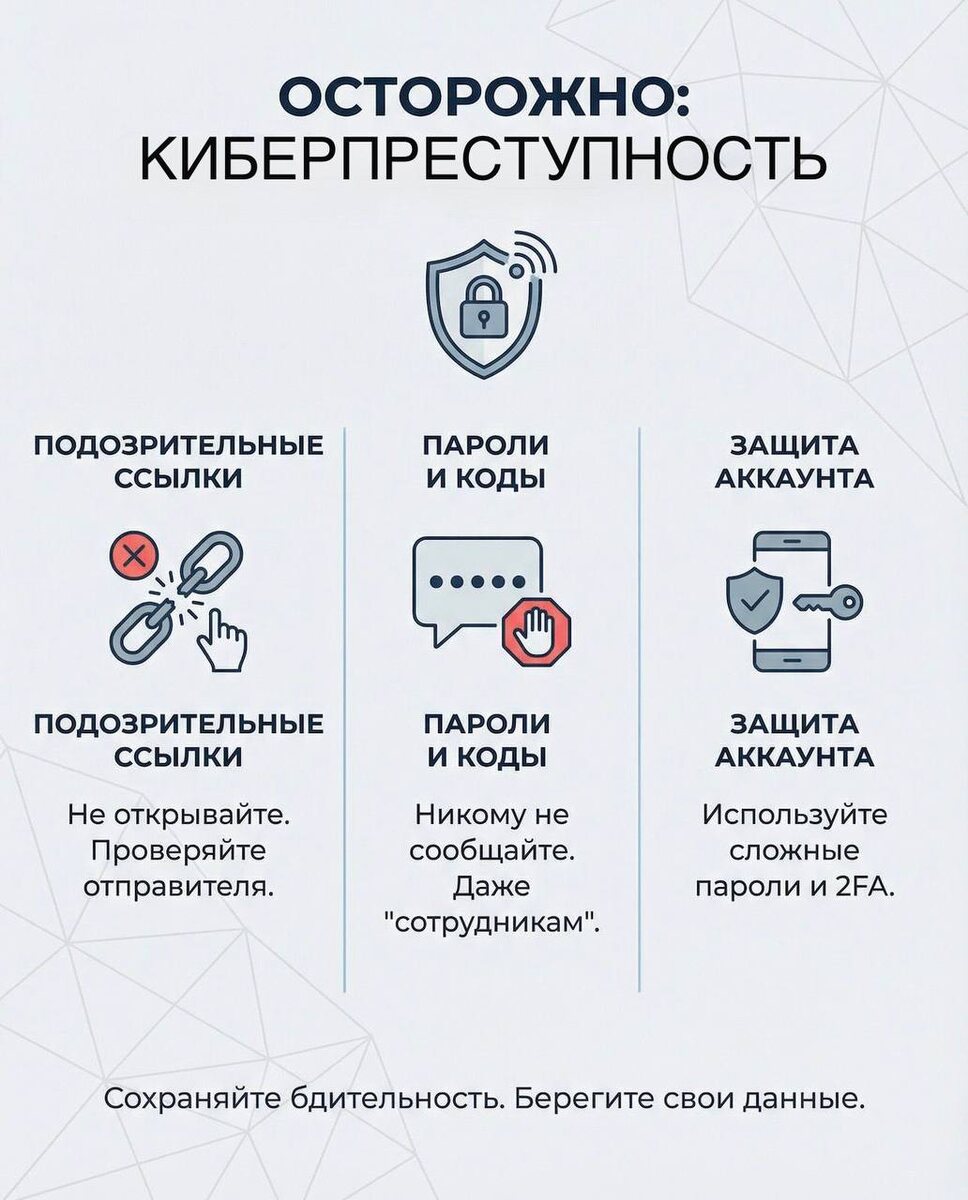 ! В связи с волной участившихся случаев взлома учетных записей в мессенджерах и социальных сетях, просим вас с особой внимательностью относиться к своей безопасности в интернете. Пожалуйста, будьте осторожны: • Не открывайте подозрительные ссылки и файлы, полученные от неизвестных или даже от знакомых, если их отправка кажется вам необычной. • Не сообщайте свои пароли и коды подтверждения никому, даже если собеседник представляется сотрудником известной организации. • Используйте сложные пароли и двухфакторную аутентификацию, где это возможно. • При малейших сомнениях в подлинности сообщения или аккаунта – не переходите по ссылкам, не скачивайте файлы. Сохранив осторожность и внимательность, вы сможете защитить себя и свои данные от злоумышленников. Берегите себя и своих близких!