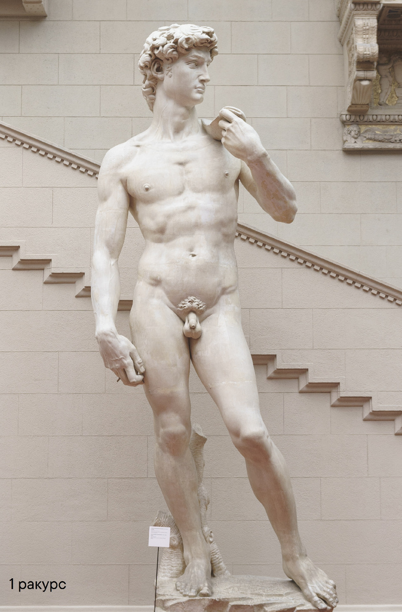 Слепок «Давид» со скульптуры Микеланджело в Итальянском дворике Пушкинского музея с идеальной точностью повторяет размер и все детали оригинала, который находится в Галерее Академии во Флоренции. Но есть нюанс: слепок стоит ниже, чем изначально задумывал скульптор, поэтому Давид смотрится непропорционально — слишком большие голова и руки. Но расположение слепка в Итальянском дворике позволяет нам увидеть не только главные ракурсы, но и уникальные, которые доступны только в Пушкинском музее. Что такое «классические» ракурсы? 1. Фронтальный вид создает иллюзию царственного спокойствия, но до тех пор, пока мы не начинаем рассматривать детали: вздутые вены на правой руке и шее, напряжение мышц. В обманчиво расслабленной позе Микеланджело создаёт сильнейшее внутреннее напряжение, которое готово стать непреодолимой силой. Это образ уверенности человека перед лицом смертельной опасности. 2. В ракурсе в три четверти слева появляется движение. На площади Синьории, где установлена скульптура, э