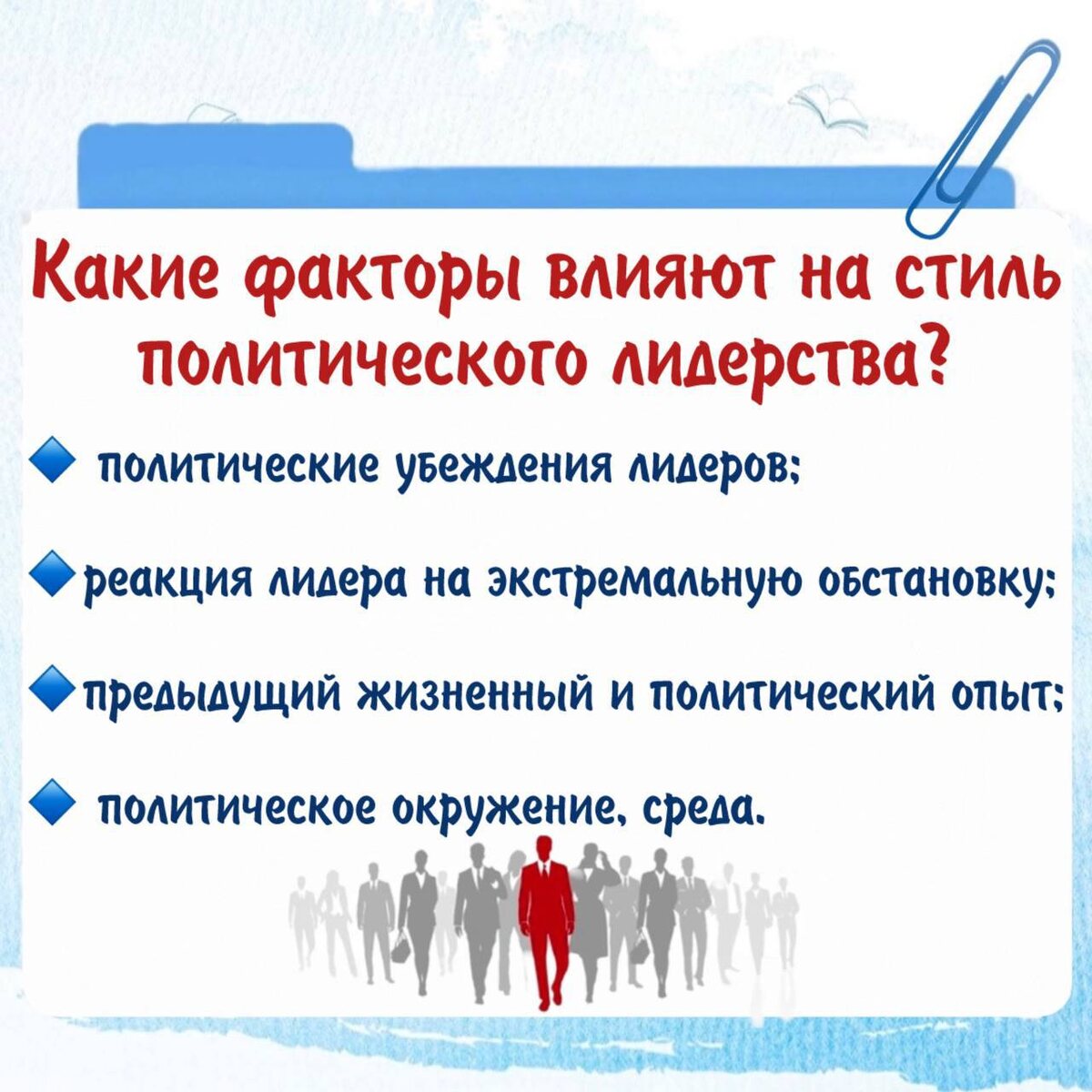 » Начало найдете здесь! ❓Какие функции политического лидера существуют? ⠀ ✔️Программная функция - определение и формулирование интересов социальных групп, целей социальной и политической деятельности, выявление способов и методов реализации интересов и достижения целей ⠀ ✔️Управленческая функция - принятие политических решений ⠀ ✔️Коммуникативная - организация и поддержание контакта с обществом, с различными социальными группами и организациями; упрочение эмоциональной связи с народом ⠀ ✔️Интегративная функция - объединение, сплочение общества ⠀ ✔️Представительная - представление интересов определенной общественной группы, ведение политической дискуссии с оппонентами ⠀ ✔️Мобилизационная - мобилизация масс на достижение политических целей. ⠀ 📌Изучите карточку👆с факторами, влияющими на стиль политического лидера. ⠀ Сохраняйте материал и пользуйтесь! И не забудьте про 🔥 Мой резервный канал в мессенджере MAX #полезноеобщага