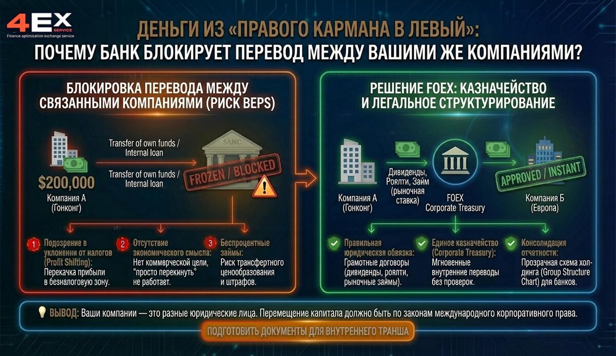 ? У вас есть торговая компания в Гонконге (где скопилась прибыль) и операционная компания в Европе (где нужно платить зарплаты). Обе компании принадлежат вам. Вы отправляете $200,000 из Азии в ЕС с назначением «Transfer of own funds» или «Internal loan». На следующий день европейский банк замораживает транзакцию и требует объяснений. Как так? Это же ваши личные деньги! 📉 Почему банки ненавидят переводы между связанными компаниями? Для налоговых и финансовых регуляторов внутригрупповые переводы — это зона максимального риска, которую называют "Размывание налоговой базы" (BEPS). 1️⃣ Подозрение в уклонении от налогов (Profit Shifting): Банк думает, что вы искусственно перекачиваете прибыль из страны с высокими налогами в безналоговую зону, чтобы скрыть доходы. 2️⃣ Отсутствие экономического смысла: Для комплаенса "просто перекинуть деньги" — не аргумент. Любая транзакция между юрлицами должна иметь коммерческую цель. Если компания А ничего не продает компании Б, почему она дает ей де