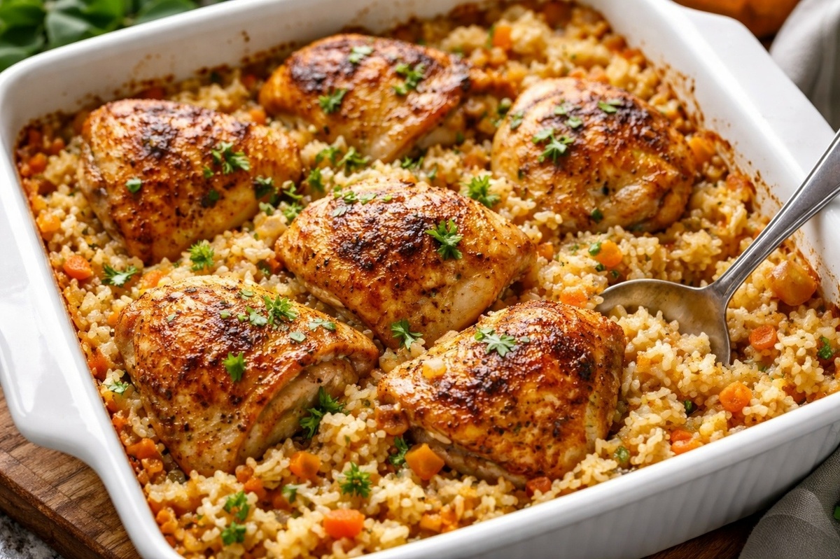 Вот честно, у вас бывает такое состояние: вроде бы и ужин нужен, и дома все голодные, а стоять у плиты — вообще не вариант? Не потому что лень, а потому что просто нет ресурса. И в этот момент любая готовка начинает раздражать уже на этапе «достать сковородку». Раньше я в такие дни делал всё по классике: отдельно рис, отдельно курица, потом ещё соус какой-нибудь… В итоге — гора посуды, куча времени и ощущение, что весь вечер провела на кухне... И я решила не мудрить и сделать всё в одной форме, тогда результат меня очень порадовал, сама не ожидала от такого результата! Здесь всё работает за счёт простоты. Мы не готовим гарнир отдельно, не жарим курицу заранее, не стоим у плиты. Всё собирается в одной форме и отправляется в духовку. Но самое главное — это вкус. Рис здесь не сухой и не «сам по себе», он пропитывается соком курицы, специями, овощами. Получается уже не гарнир, а полноценное блюдо, где всё работает вместе. И да, после этого ужина на кухне не остаётся ощущение, что был кулин