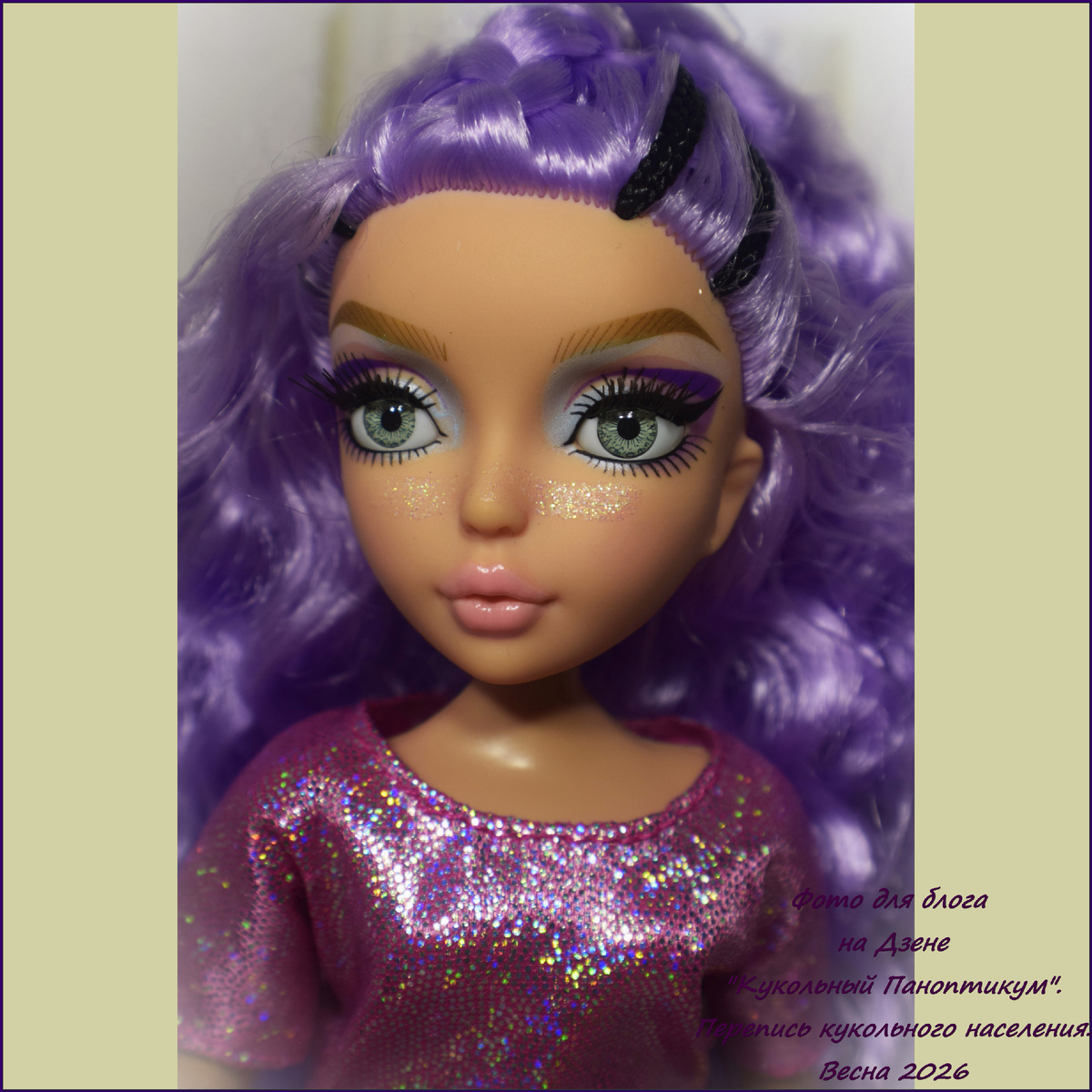 Первая кукла — Гармония (Harmonique): Эта очаровательная красавица сражает наповал своими роскошными фиолетовыми кудрями, которые каскадом спадают до самой земли. Её волосы — это настоящее произведение искусства: длинные, объемные, с идеальными локонами и черными прядями, добавляющими образу глубины и контраста. 👀 Большие зеленые глаза с выразительными ресницами и фиолетовым макияжем смотрят на мир с детской непосредственностью и любопытством. На щечках видны золотистые блестки, подчеркивающие её магическую природу.