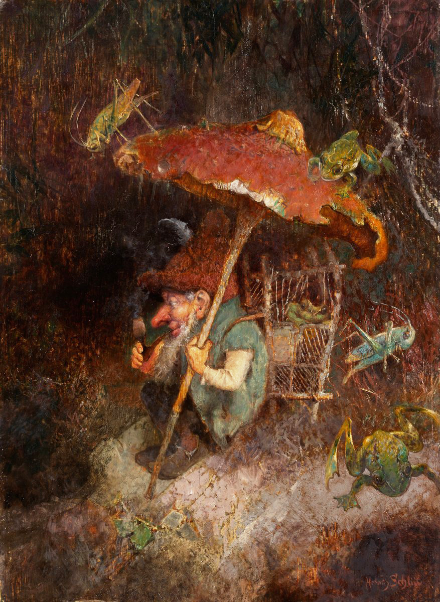 Гномы — популярный и часто встречающийся сюжет на картинах немецкого художника Генриха Шлитта (1849–1923). Эти лесные существа, придуманные человеческим воображением, могут быть как положительными, так и отрицательными героями, но на картинах Шлитта они почти всегда показаны в хорошем свете. В его работах, не лишенных юмора, миниатюрные герои могут быть изображены пускающими пузыри из шляпки гриба, гоняющимися за бабочками сачком, поющими серенады древесной лягушке, готовящими суп, рисующими, читающими газету или курящими трубку, бродя по лесу, обычно в сопровождении лягушек и сверчков. Генрих Шлитт может быть знаком не только поклонникам живописи, так как художник пробовал себя в самых разных жанрах. Его имя встречается во многих публикациях, книгах, периодических изданиях и газетах, но, пожалуй, сегодня он наиболее популярен среди коллекционеров кружек. Шлитт был одним из самых выдающихся художников, работавших на Villeroy & Boch, известного немецкого производителя фарфора. Созд