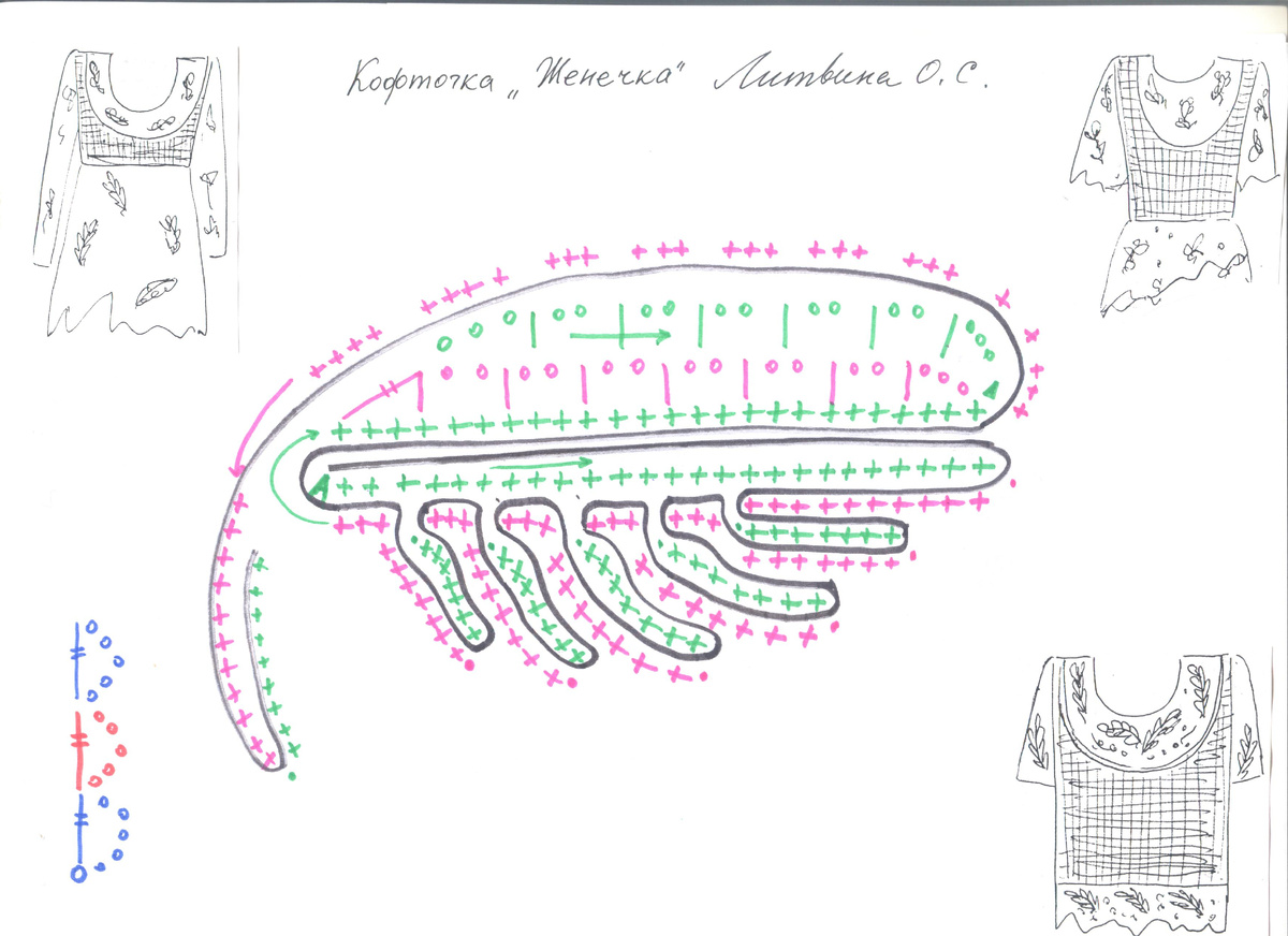 Для бурдона подойдёт вискозный сутаж, около 15 м. Идея этой кофточки заключается в том, чтобы создать впечатление двух кофточек, надетых друг на друга. Свяжите маечку нитками цвета "А" по выкройке с втачным рукавом. Как построить выкройку: https://youtu.be/e1_Wkt-JQuM?si=AL6AVu2_qYiJ3HVv ? Эта маечка - лиф, может быть разной длины, как показано на эскизах. На маечке сделайте большое декольте. Для основного полотна маечки используйте не сложный ажурный рисунок, который показан на схеме.