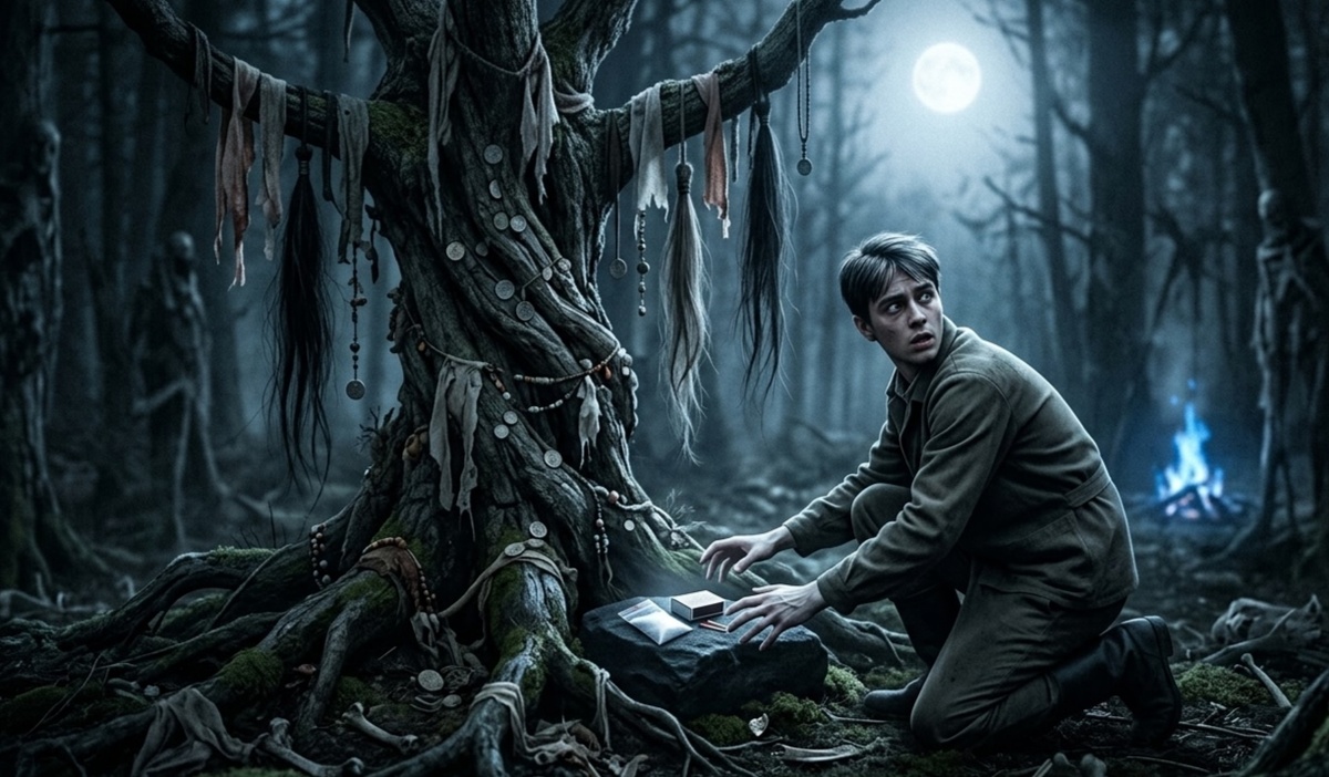 Спустя полчаса он вышел на поляну, в центре которой возвышалось Оно. Дерево казалось живым; казалось, оно дышит. В лунном свете, неестественно холодном и ярком, Витя увидел у корней, среди ритуальных лент, новенький коробок спичек и нераспечатанную пачку соли. Они лежали там так удобно, словно ждали именно его. Мальчишеский рационализм победил трепет: «Кто-то оставил, а нам нужнее», — подумал он.