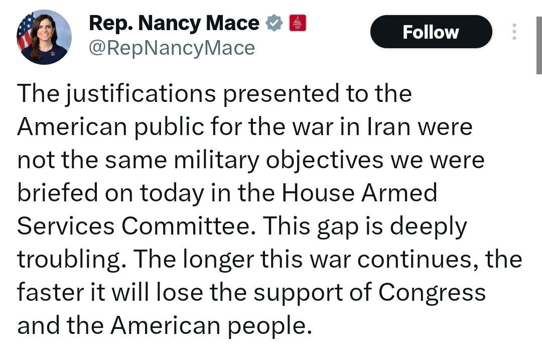 Rep. Mace given DIFFERENT justifications for Iran War than those given to American public 'DEEPLY troubling gap' 'Longer this war continues, FASTER it will lose support of Congress and American people'