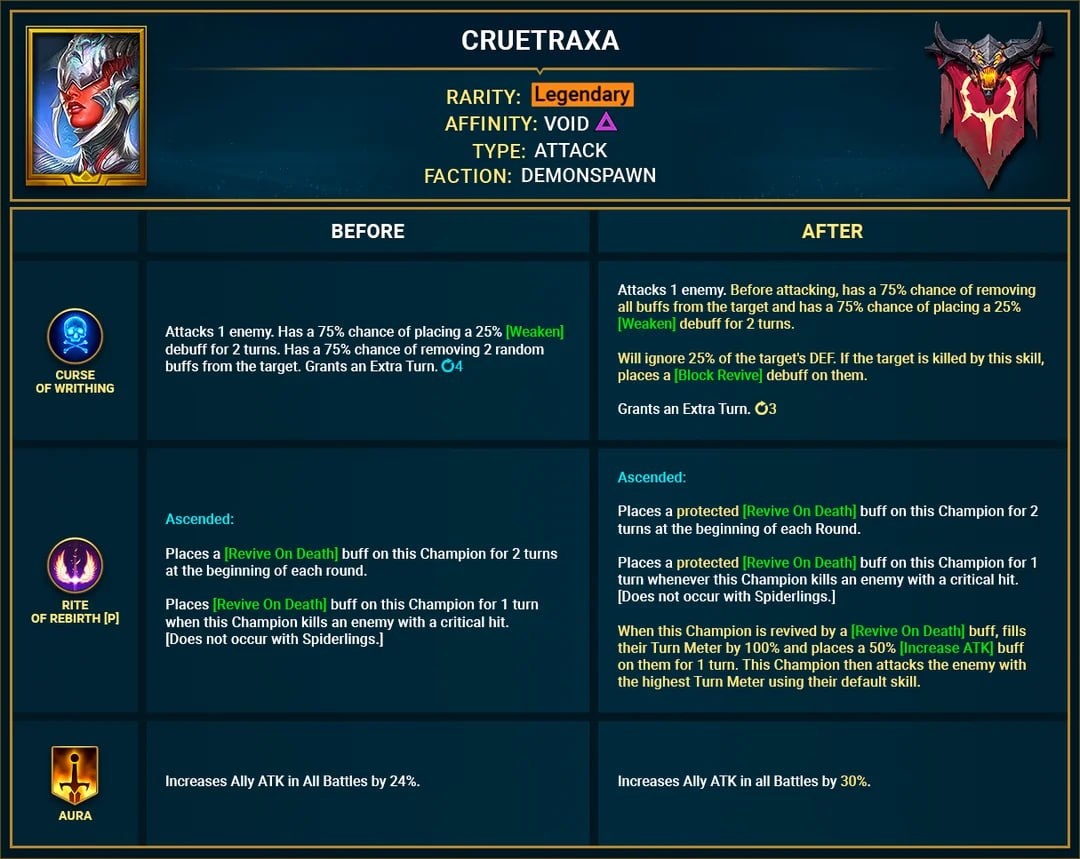 Крутракса А2 - Смертельные Судороги Атакует 1 врага. Перед атакой имеет 75% шанс снять все положительные эффекты с цели и 75% шанс наложить штраф [Слабость] на 25% на 2 хода. Игнорирует 25% защиты цели. Если цель убита этим навыком, накладывает на неё [Блок воскрешения]. Затем ходит ещё раз. КД - 3 хода Обряд Спасения (пасс.) В начале каждого раунда накладывает на этого Чемпиона защищённый бонус [Возрождение] на 2 хода. Накладывает на этого Чемпиона защищённый бонус [Возрождение] на 1 ход всякий раз, когда этот Чемпион убивает врага критическим ударом. [Не действует с Пауками.] Когда этот Чемпион возрождается благодаря бонусу [Возрождение], его шкала хода заполняется на 100%, и на него накладывается Бонус атаки 50% на 1 ход. Затем этот Чемпион атакует врага с наибольшей шкалой хода, используя свой основной навык. Аура Увеличивает атаку союзников во всех сражениях на 30%. Инкарнат А1 - Непрошеный Гость Атакует 1 врага 2 раза. Каждый удар имеет 45% шанс наложить [Провокация] на 1 ход.
