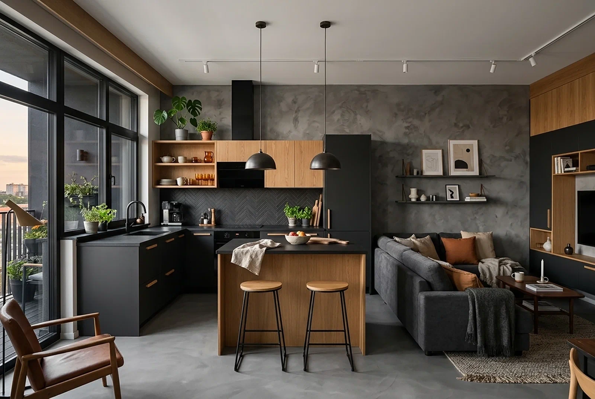 Микроцемент умеет подстраиваться под стиль и уместен почти в любом интерьере. Главное — избегать крайностей. Если использовать такую отделку одновременно для пола и стен, то пространство получится слишком «холодным». Это приемлемо для лофта и индастриала, но сомнительно для других стилей: