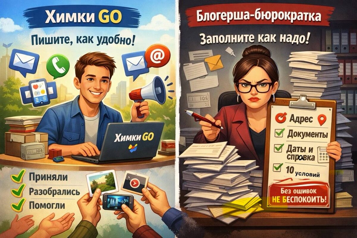 ХимкиGO изначально строился как площадка, куда может написать любой житель — без бюрократии, без «правильных форм» и без страха. И, судя по отклику, это работает. Канал читают, индексируют в поисковиках и губернаторском мониторинге, на него ссылаются. Но главное — через ХимкиGO реально решаются проблемы. И значительная часть публикаций появляется именно благодаря вам — химчанам, которые присылают фото, видео, сообщения, сигналы. ✉️ Написать можно куда угодно: в личные сообщения канала, в отдельный аккаунт редакции, на электронную почту. И скоро добавим ещё один оригинальный способ связи. Просто по-человечески. А теперь — к контрасту. Появилась в Химках одна баблогерша, которая уже примеряет на себе шкуру чиновника-бюрократа: если уж принимать обращения от людей, то только через… полосу препятствий. Причём такую, что проще уже самому проблему решить, чем ей написать. Список требований — почти как в ведомстве: 📍 Укажите точный адрес, микрорайон, координаты, крестик на карте 📅 Всп