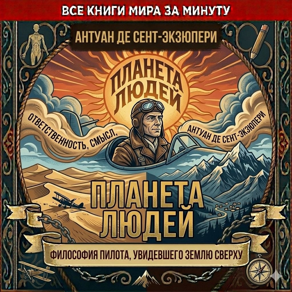 В С Е К Н И Г И М И Р А З А М И Н У Т У Антуан де Сент-Экзюпери — «Планета людей» Суть в одной фразе: Глубокое философское размышление о смысле жизни, ответственности и человеческих связях, написанное пилотом, который видел землю с высоты птичьего полета. Мир и герои: 1920-е и 30-е годы. Это не роман в привычном смысле, а сборник очерков, основанных на реальном опыте автора. Герои здесь — летчики первых почтовых авиалиний, которые каждый день бросали вызов стихиям: пустыне, горам и ночи. Сюжетный драйв: * Борьба со стихией: Описание легендарных перелетов через Анды и Сахару. Это не просто приключения, а моменты истины, когда человек остается один на один с песком и звездами. * Катастрофа в пустыне: Самый мощный эпизод — падение автора в Ливийской пустыне. Пять дней без воды, галлюцинации и медленное умирание от жажды. В этом пограничном состоянии он осознает истинную ценность глотка воды и человеческого участия. * Философия ответственности: Автор утверждает, что «быть человеком — это ч