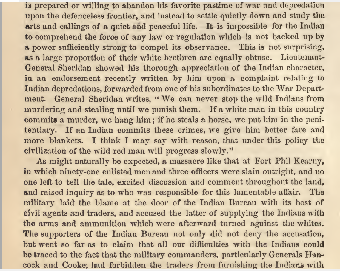 Предлагая вашему вниманию нижеследующие свидетельства, которые сочтут важными все, кому действительно интересен предмет наших взаимоотношений с Индейцами, я приведу только те, которые исходят от людей, чей интерес в этих делах происходит из личного опыта и предположительно хорошего знания Индейской натуры, и желания быть честными по отношению как к Индейцам так и к Правительству. Пока я это пишу, признаки всеобщей Индейской войны по всему фронтиру, от Британских владений на севере до Мексиканской границы на юге, нависают над нами тяжелой тучей. Закончится ли это именно такой войной или серией отдельных актов варварства мы скоро увидим. Но того, что известно, уже достаточно для уверенности в том, что ещё не настал тот день, когда не ведающие законов дикари равнин захотят и будут готовы оставить своё любимое развлечение войной и разбоем в отношении беззащитных жителей фронтира, и вместо этого спокойно осесть и обустроиться, и заняться искусствами и прочими призваниями мирного образа жизни. Индейцы всё ещё не способны постичь силу законов и правил, не подкреплённых властью достаточно сильной для того. чтобы вынудить их признать её существование. И это тоже не удивительно, так как изрядная доля их белых собратьев ничуть не уступают им в туповатости. Недавно, в сопроводительной надписи на жалобе по поводу индейских разбойных нападений, передаваемой от одного из его подчинённых в Военный Департамент, Генерал-Лейтенант Шеридан продемонстрировал хорошее понимание особенностей Индейского характера. Как пишет Генерал: "Мы не сможем удерживать диких Индейцев от убийства и краж, если не будем их наказывать. Когда белый человек совершает в этой стране убийство, мы его вешаем; кода он крадёт лошадь, мы сажаем его в тюрьму. А когда Индеец совершает такие же преступления, мы начинаем с ним лучше обходиться и дарить ему больше одеял. Полагаю, что могу уверенно утверждать, что при такой политике приобщение к цивилизации диких красных людей будет продвигаться очень медленно"...