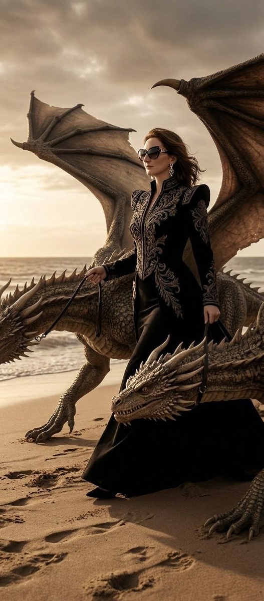 Промпт — мать драконов Новая интерпретация старого промпта от подписчицы @peraspera0ad0astra Не меняя внешности женщины точная копия лица, без очков, цвета и длины волос 1:1 с исходника 1. Макияж идеальный не старя возраст. Укладка волос романтичная, длина волос до плеч, цвет волос каштановый. Украшения только серьги дополняющие образ, по одной серьге в ухе. Руки без браслетов и колец. Женщина идёт вдоль песчаного пляжа в боковом ракурсе, на ней экстравагантный наряд в духе haute couture givenchy, создающий эффект роскоши и опulence, длина платья до песка, шлейф развивается, рукава до кистей закрыты, массивные дизайнерские солнцезащитные очки. На ногах тонкие сапоги из кожи гармонируют с платьем. Она крепко держит поводки и ошейники двух огромных драконов, идущих рядом с ней. Динамичная композиция, выразительные позы и движение. цветовая палитра: песок, бежевый, сепия. Если тормозит Telegram, делаю в русском веб-сервисе gptunnel (промокод на скидку 75% PROMPT1_75 ) Если Telegram